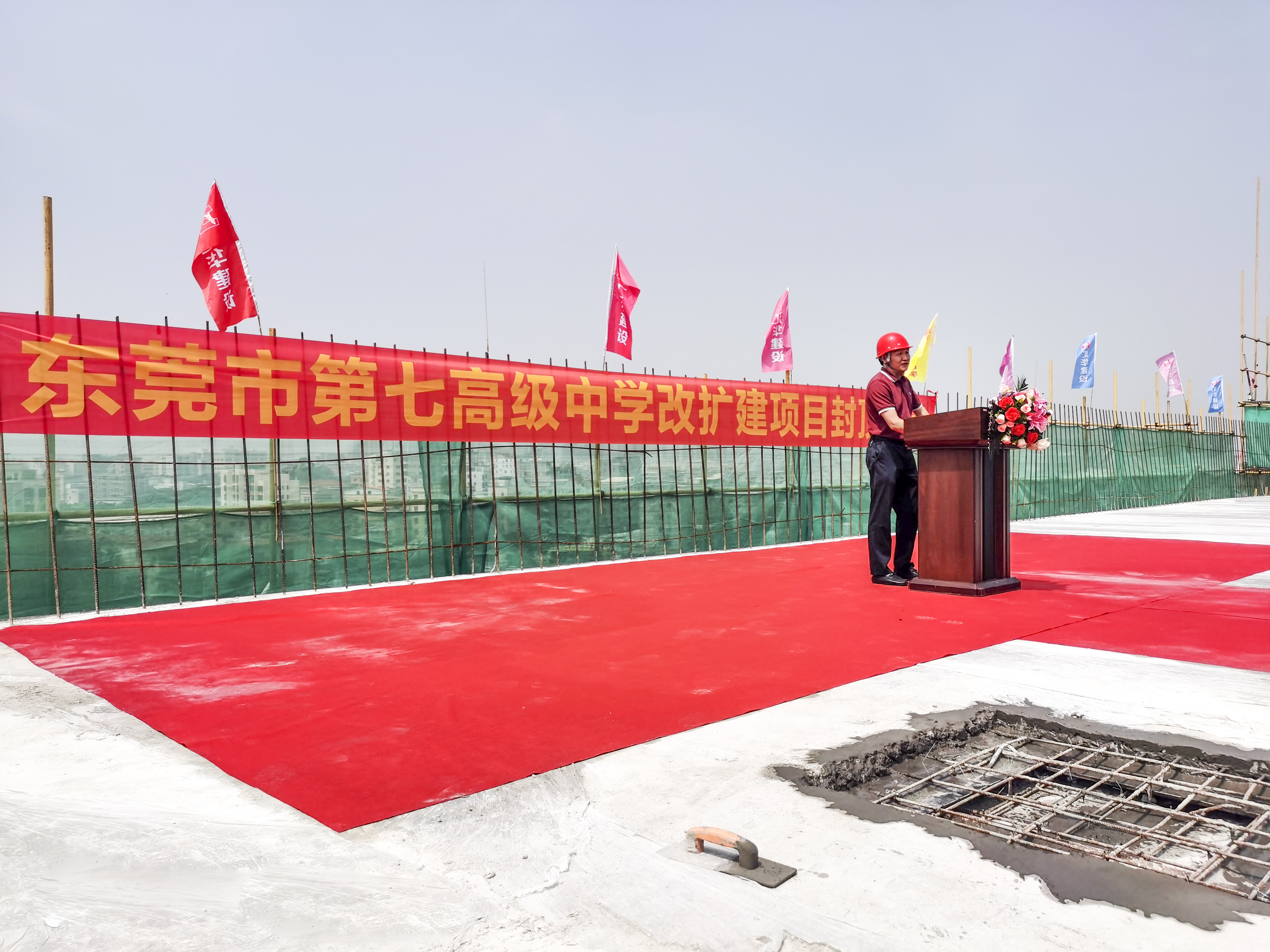 (封頂儀式現場) 東莞市城建局調研員馬文標先生、東莞市第七高級中學校長段文宏先生、廣東匯華建設集團有限公司董事長麥照華先生等領導先后致辭,隨后與廣東匯華建設集團有限公司副總經理廖志峰先生等領導一起出席封頂儀式。